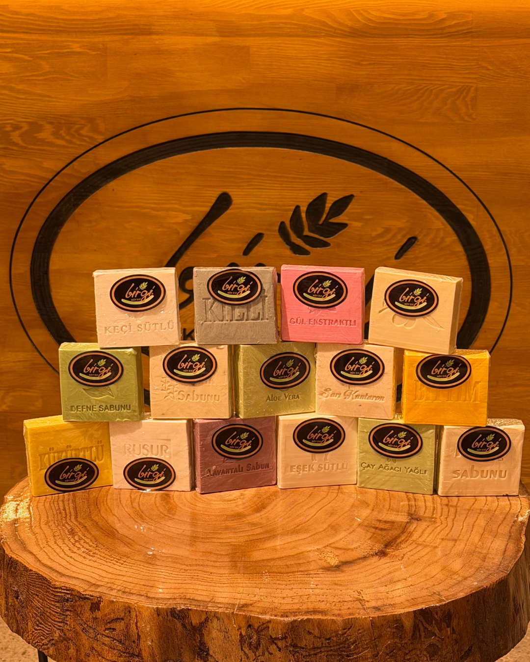 Sabunlarımız arasında keçi sütlü, eşek sütlü, zeytinyağlı, lavantalı, gül özlü, aloeveralı, kükürtlü, kil, ruşur, sarı kantaron, çay ağacı yağı, defne, bıttım, pirinç ve kekik sabunu gibi çeşitler bulunur.